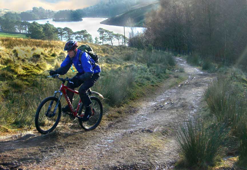 The road that runs past Hillend Ski Slope is the A702. If you follow this road for about 2 miles towards Carlisle (southwards) you will see a turning of to your right that takes you into the Inn at Flotterstone. Turn right here and it will take you to the start of the of the Pentland Hills Regional Park. If you are into Hill walking, Mountain Biking, Wild life and Fishing this is the place for you to be. There is a car park at the Ranger Station on the right just past the entrance to the Inn. A tourist information office and toilets are within the car park. Just at the entrance to the car park is a barbecue and children's play area. The road leads you right into the heart of the Regional Park. About a mile or so into the park you will come across Glencorse Reservoir, as can be seen in the background on the photograph on the left. A mountian biker is making his way across the Regional Park.