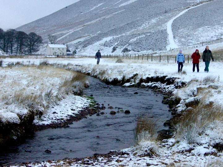 Follow the links and it will give access information to more routes. Many of the routes used by hill walkers follow the same route as that used by mountain bikers. On parts of the route mountain bikers can be traveling at a high rate of knots. Keep safety in mind. A map of the area around Flotterstone can be found here and a map of the area around Hillend can be found here. Both the areas around Hillend and Flotterstone are used all the year round. As you can see on the photograph on the left of this paragraph. It was taken in January. The area in question is a house called the Howe, just on the west side of Loganlea Reservoir. You can see a distinct track running up the hill and if you check the map you can see it is very evident. Do keep in mind that the reservoirs are public water supplies and the hills are used for sheep farming. During the lambing season be aware of new born lambs. A squashed lamb can upset your family and ruin a good day. The area is also teaming with bird and wild life. While out for the day do take a good pair of binoculars with you and of course a camera is a must. Your day here for what ever reason, can be planned well before you even leave home and this saves valuable holiday time, not to mention money. I hope you find those few links of use.